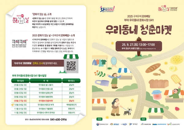 [충청중심뉴스] 충남문화관광재단은 ‘문화가 있는 날’ 주간을 맞아 오는 9월 27일 오후 1시부터 5시까지, 부여 궁남지 포룡정 일원에서 ‘2025 구석구석 문화배달 부여 5회차 ‘우리동네 청춘마켓’’을 개최한다.