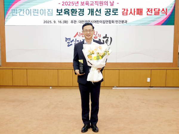 [충청중심뉴스] 대전광역시의회 민경배 의원은 9월 16일 민간 어린이집 보육환경 개선과 보육 교직원 권익 증진에 기여한 공로로 감사패를 받았다고 밝혔다.