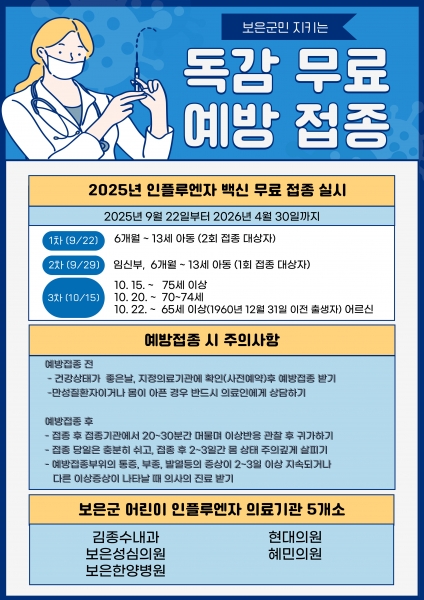 예방접종은 △김종수 내과 △현대의원 △보은성심의원 △혜민의원 △보은한양병원 등 5개 의료기관에서 받을 수 있으며 일정은 △2회 접종 대상 어린이는 9월 22일부터, △1회 접종 대상 어린이와 임신부는 9월 29일부터 접종이 가능하다.