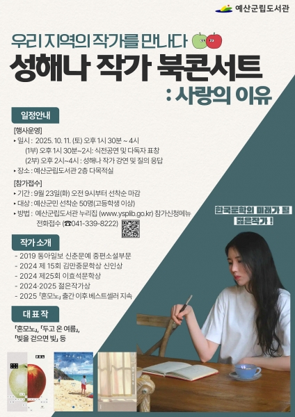 성해나 작가는 예산군 출신 소설가로 2019년 동아일보 신춘문예 당선으로 데뷔한 후 꾸준한 작품 활동을 이어오며 2024·2025 문학동네 젊은작가상, 2024 이효석문학상 우수작품상, 2024 김만중문학상 신인상을 수상하는 등 최근 가장 주목받는 작가 중 한 명이다.
