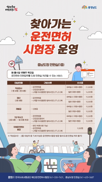 찾아가는 운전면허시험장은 한국도로교통공단 예산운전면허시험장과 협력해 운전면허 관련 민원 업무를 도청 민원실에서 직접 처리하는 서비스로 내포신도시 인근 거주 도민들에게 큰 호응을 얻고 있다.