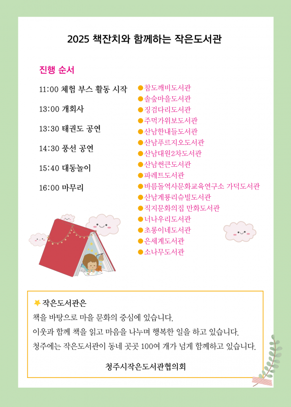 [충청중심뉴스] 청주시작은도서관협의회가 주관하고 청주시가 후원하는 2025 청주시 작은도서관 책잔치가 오는 27일 오전 11시부터 오후 4시까지 분평동 원마루공원에서 열린다.