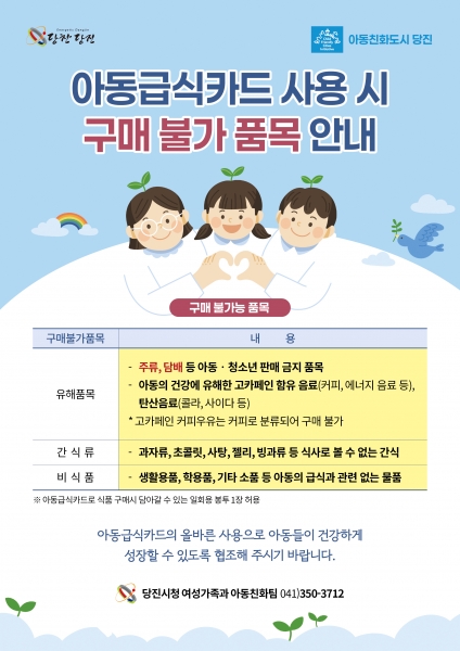 [충청중심뉴스] 당진시는 아동급식카드의 투명하고 원활한 운영을 위해 아동급식카드 대상자 589명, 관내 아동급식 가맹점 40개소에 ‘아동급식카드 사용 시 구매 불가 품목 안내문’을 배포했다고 17일 밝혔다.