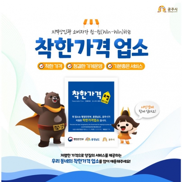 [충청중심뉴스] 공주시는 저렴한 가격으로 지역 물가 안정에 기여하고 있는 ‘착한가격업소’를 오는 24일까지 공개 모집한다고 밝혔다.