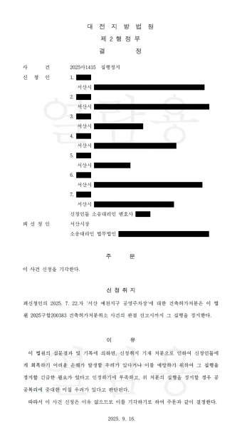 법원은 결정문을 통해 "처분의 집행을 정지할 경우 공공복리에 중대한 미칠 우려가 있다"고 판단했다.