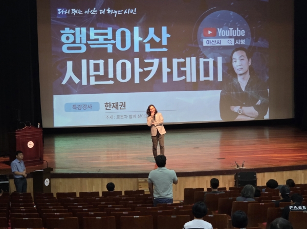 [충청중심뉴스] 아산시는 16일 평생학습관 아산아트홀에서 행복아산시민아카데미 네 번째 강연으로 한재권 한양대학교 로봇공학과 교수의 ‘로봇과 함께 살아갈 세상’을 진행했다고 밝혔다.