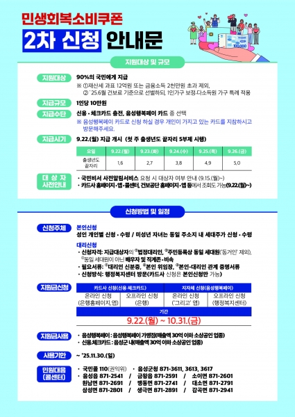 [충청중심뉴스] 음성군은 이달 22일부터 2차 민생회복 소비쿠폰을 지급한다.