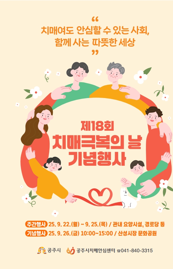 이어 26일 산성시장에서 열리는 기념행사에서는 △치매 인식 개선 캠페인 △치매 퀴즈 △치매·우울감 선별검사 △공주시 보건소 주요 사업 홍보 등 시민이 직접 참여할 수 있는 프로그램이 마련돼 치매에 대한 관심을 높이는 계기가 될 것으로 기대된다.