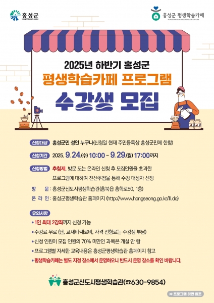[충청중심뉴스] 홍성군은 오는 24일부터 29일까지 4일간 평생학습 저변 확대를 위한 하반기 평생학습카페 프로그램 수강생을 모집한다.