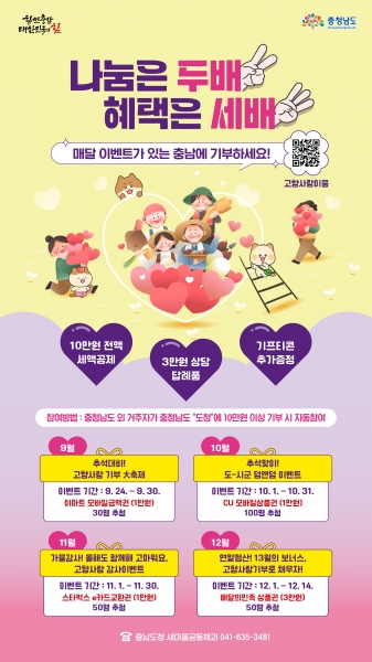 [충청중심뉴스] 충남도는 고향사랑기부제에 대한 관심과 참여를 높이기 위해 연말까지 다채로운 이벤트를 실시한다고 22일 밝혔다.