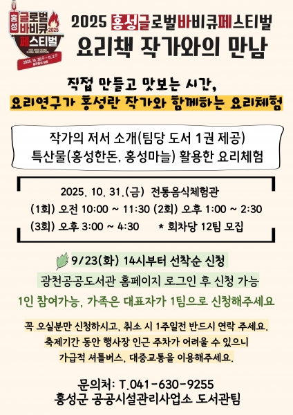 이번 행사는 2025 홍성글로벌바비큐페스티벌과 연계해 지역 특산물을 활용한 요리 체험과 작가와의 소통을 통해 독서문화 확산과 농·특산물 홍보를 함께 추진한다.