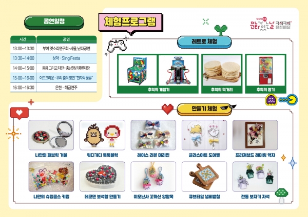 ‘레트로 체험존’에서는 △추억의 게임기 △추억의 먹거리 △추억의 뽑기를 즐길 수 있으며 ‘만들기 체험존’에서는 △나만의 패브릭 거울 △워디가디 톡톡 블록 △레이스 리본 머리핀 △글라스아트 도어벨 △데코덴 보석함 만들기 △이오난사 꼬까신 양말목 △큐브타일 냄비 받침 △프리져브드 레터링 액자 △전통 보자기 자석 △나만의 슈링클스 키링 등 남녀노소 누구나 참여할 수 있는 다채로운 프로그램이 준비되어 있다.