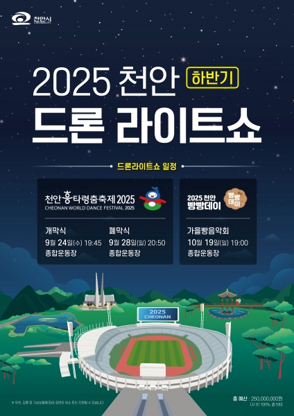 시는 오는 24일 천안종합운동장 일원에서 열리는 천안흥타령춤축제 2025 개막식을 시작으로 28일 폐막식에서 각 회차당 1,000여 대의 드론 군집비행을 선보인다.