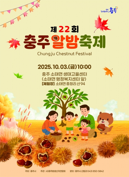 [충청중심뉴스] 전국 최고의 품질을 자랑하는 충주 알밤을 주제로 한 제22회 충주 알밤축제가 오는 10월 3일 오전 10시, 충주시 소태면 생태고을센터 일원에서 열린다.