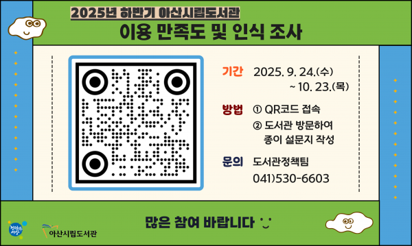 고영이 아산시립도서관장은 “이번 설문조사가 시립도서관 서비스 개선과 발전 방향을 정하는 데 중요한 기초자료가 될 것”이라며 “시민 여러분의 적극적인 참여를 부탁드린다”고 말했다.