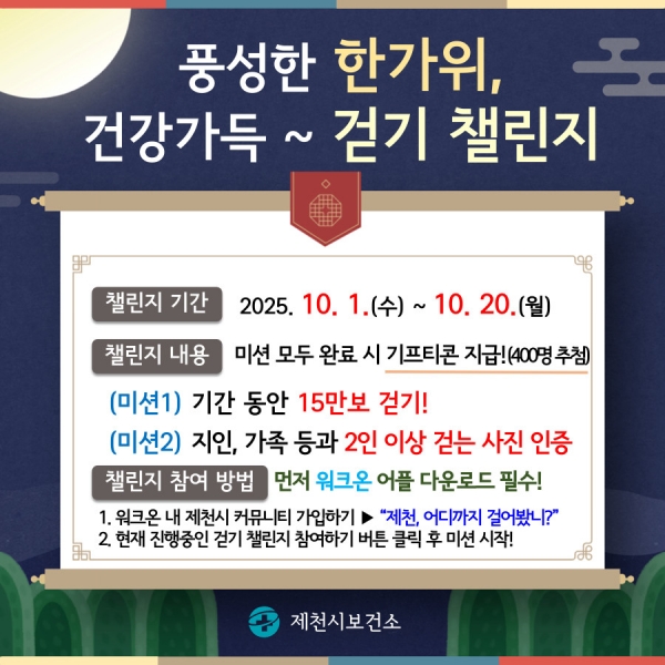 [충청중심뉴스] 제천시보건소는 추석 연휴를 맞아 시민의 걷기 실천을 돕기 위해 ‘풍성한 한가위, 건강가득 걷기 챌린지’를 운영한다.