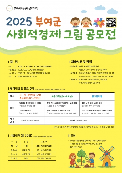 [충청중심뉴스] 부여군지역공동체활성화재단 사회적경제지원센터는 관내 어린이와 청소년을 대상으로 ‘2025 사회적경제 그림 공모전’을 개최한다고 밝혔다.