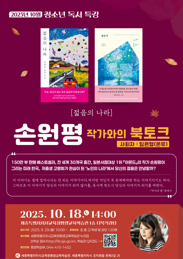 [충청중심뉴스]세종시교육청평생교육학습관(관장 김희경, 이하 평생교육학습관)이오는 10월 18일(토) 오후 2시, 소설가이자 영화감독인 손원평 작가를 초청해 책마당(북콘서트)를 개최한다.