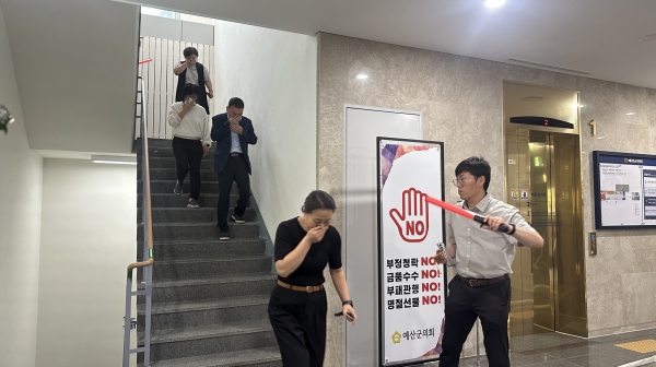 특히 예산소방서 금오119센터 대원들이 참여해 소화기·소화전 사용법과 대피 요령을 직접 지도하고 군청 직원들이 적극적으로 훈련에 참여해 화재 대응 역량을 한층 강화하는 계기가 됐다.
