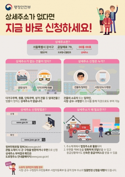 상세 주소는 건물주 또는 임차인이 정부24 또는 군청 민원과를 통해 신청이 가능하며 이후 주민등록 정정 신고를 통해 법정 주소로 사용할 수 있다.