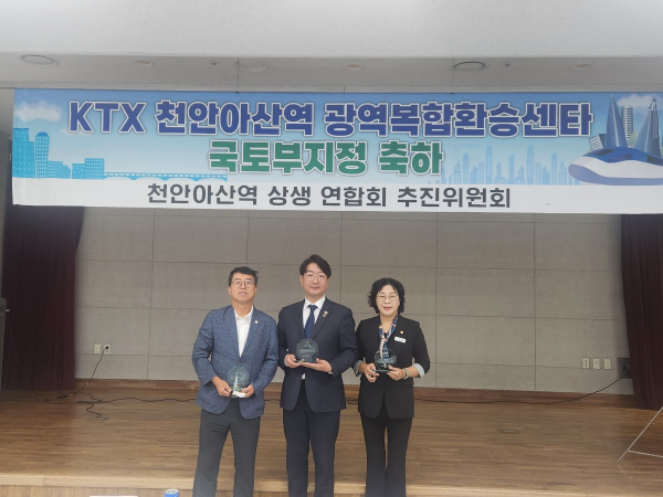 이번 행사는 KTX 천안아산역 광역복합환승센터 국토교통부 지정을 축하하기 위해 마련됐으며 이종담 천안시의원과 김명숙 천안시의원, 구형서 충남도의원이 그 동안 지역발전을 위한 헌신적인 의정활동과 꾸준한 노력의 공로를 인정받아 수상했다.