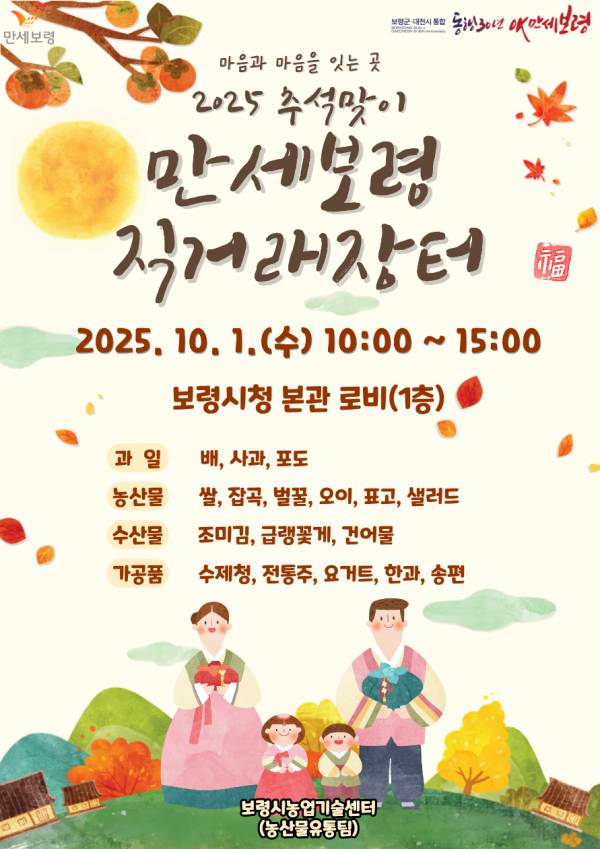[충청중심뉴스] 보령시는 추석을 맞아 10월 1일 보령시청 본관 1층 로비에서 ‘2025 추석맞이 만세보령 농특산물 직거래장터’를 운영한다고 밝혔다.
