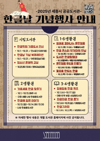 [충청중심뉴스] 세종시 공공도서관이 제579돌 한글날을 기념해 오는 10월 한 달간 한글의 소중함을 되새기고 한글을 즐겁게 체험할 수 있는 다양한 기념행사를 운영한다.