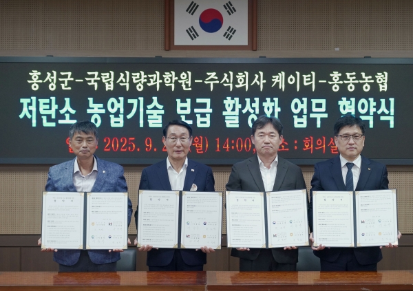[충청중심뉴스] 홍성군은 29일 국립식량과학원, KT, 홍동농협과 함께 저탄소 농업기술 보급 활성화를 위한 4자간 업무협약을 체결했다고 밝혔다.