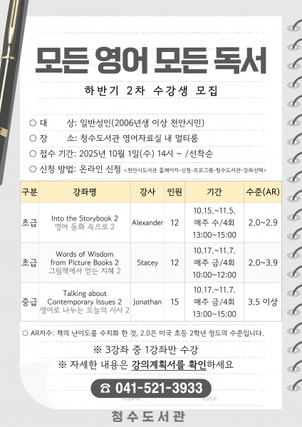 [충청중심뉴스] 천안시 청수도서관은 내일 1일부터 성인 영어 프로그램 ‘모든 영어 모든 독서’ 수강생을 모집한다고 30일 밝혔다.