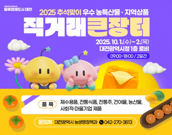 [충청중심뉴스] 대전시는 추석 명절을 맞아 10월 1일부터 2일까지 시청 1층 로비에서 ‘우수 농·특산물 및 지역상품 직거래 큰장터’를 운영한다.