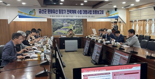 [충청중심뉴스] 금산군은 9월 30일 군청 상황실에서 금산군 문화유산 중장기 전략계획 수립 연구용역 최종보고회를 개최했다.