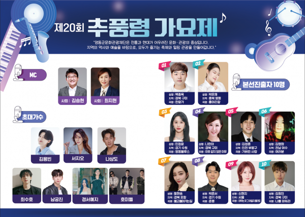 재단 관계자는 “추풍령 가요제는 신인 가수들의 발판이자 군민과 방문객이 함께 즐기는 축제의 장”이라며 “본선 참가자들의 끼와 열정, 초대 가수 공연, 그리고 전문 사회자의 진행까지 어우러져 최고의 무대가 될 것”이라고 전했다.