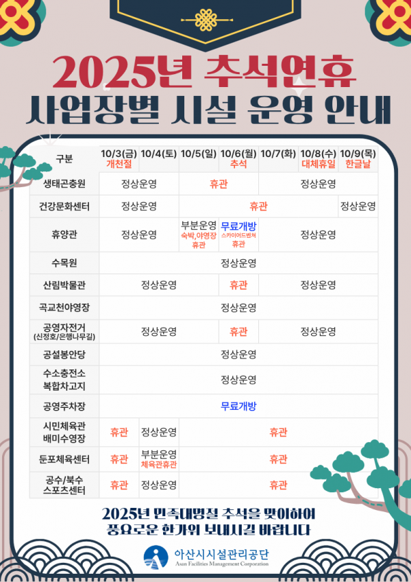 [충청중심뉴스] 아산시시설관리공단은 민족 대명절인 추석 연휴를 맞아 시민들이 안전하고 편안하게 공단 운영 시설물을 이용할 수 있도록 사업장별 운영 일정을 안내하고 연휴기간 중 안전관리에 만전을 기할 계획이다.