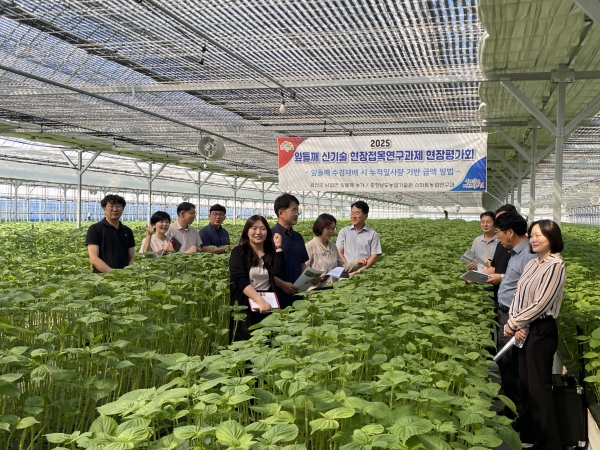 도 농업기술원은 1일 금산군 남일면 음대리 반석깻잎농장에서 잎들깨 재배농가와 연구·지도기관 관계자 등 50여명이 참석한 가운데 ‘잎들깨 수경재배 시 누적일사량 기반 급액 방법 현장평가회’를 개최했다.