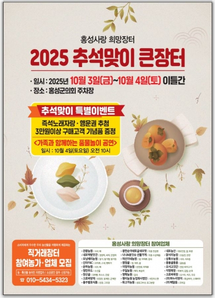 [충청중심뉴스] 홍성군은 추석 명절을 맞아 오는 10월 3일부터 4일까지 이틀간 홍주읍성 일원에서 농특산물 정례 직거래장터 ‘홍성사랑 희망장터’를 운영한다.