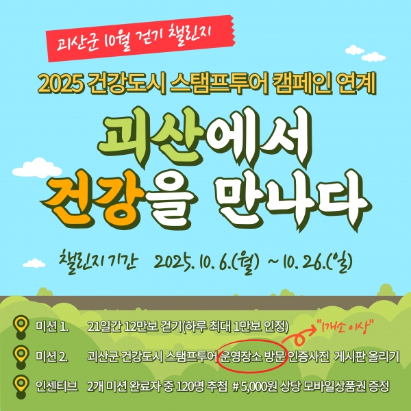 [충청중심뉴스] 충북 괴산군보건소는 한국건강증진개발원이 주관하는 ‘2025 건강도시 스탬프투어 캠페인’과 연계해 ‘괴산에서 건강을 만나다’ 걷기 챌린지를 운영한다고 2일 밝혔다.