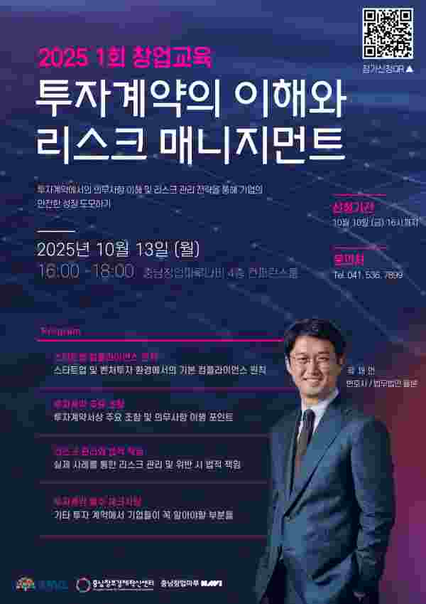 교육은 2025년 10월 13일 충남창업마루나비에서 진행되며 류재언 변호사가 강사로 참여해 스타트업 컴플라이언스 원칙, 투자계약 주요 조항, 리스크 관리 및 법적 책임, 투자계약 필수 체크사항 등을 상세히 강의할 예정이다.