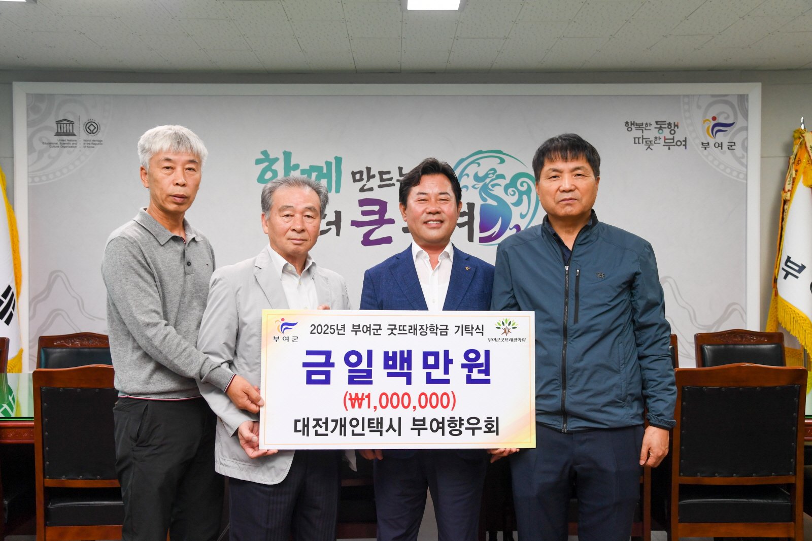 [충청중심뉴스] 대전개인택시 부여향우회(회장 추시연)가 지난 10일 (재)부여군굿뜨래장학회에 인재 육성을 위한 장학금 1백만원을 기탁했다.