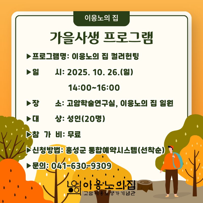 [충청중심뉴스] 홍성군 고암이응노생가기념관(이하 이응노의 집)은 오는 26일(일) 오후 2시부터 4시까지, ‘가을사생 프로그램’을 운영한다고 밝혔다.