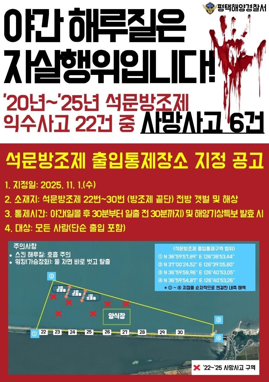 [충청중심뉴스] 당진시(시장 오성환)는 ‘연안사고 예방에 관한 법률’에 근거해 11월 1일부터 석문방조제 22번~30번 구간에 대한 야간 출입 통제를 실시한다고 14일 밝혔다.