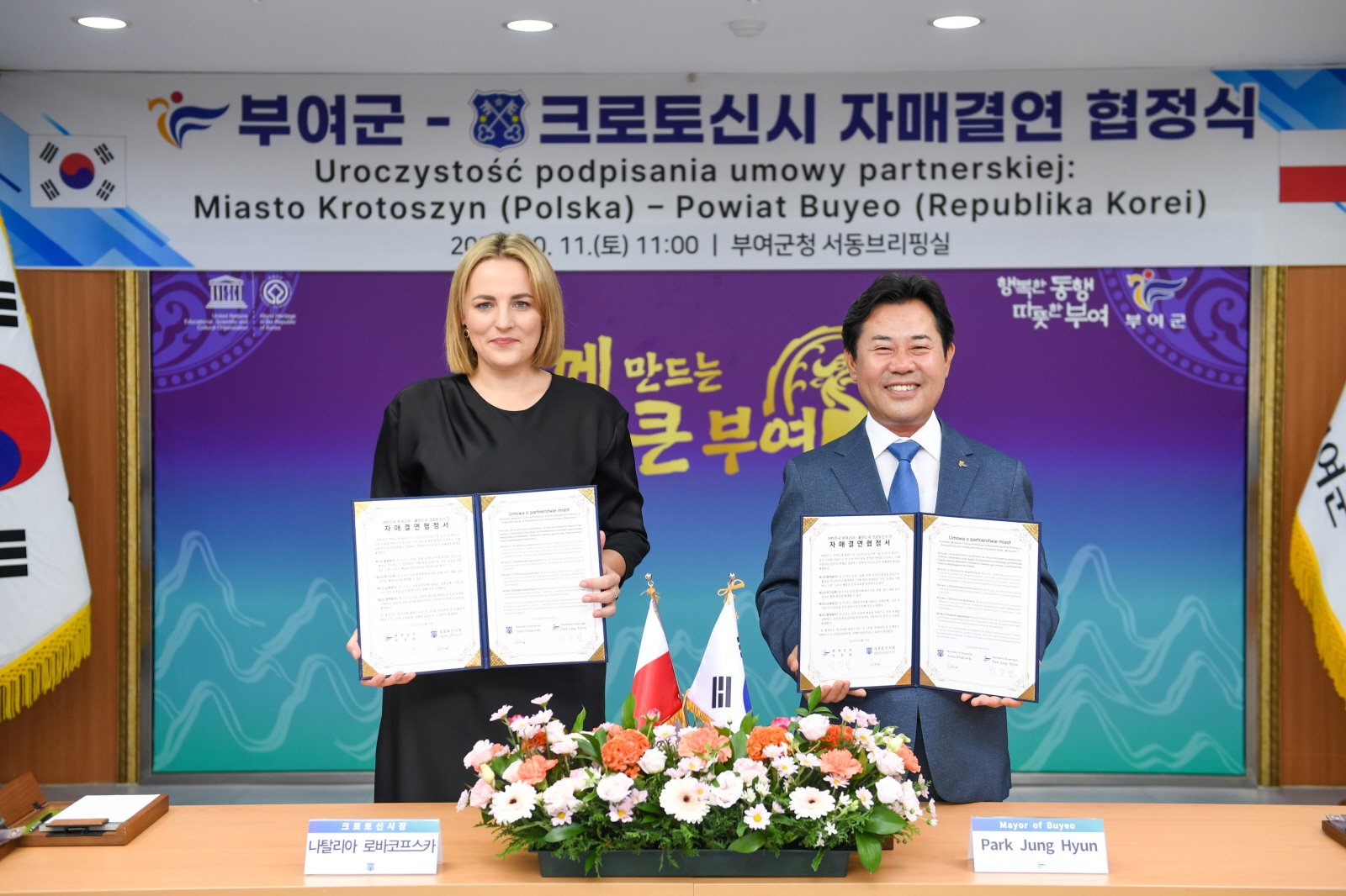 [충청중심뉴스] 부여군(군수 박정현)은 지난 11일 부여군청에서 폴란드 비엘코폴스카주 크로토신시 대표단을 공식 초청해 자매결연 협정을 체결했다.