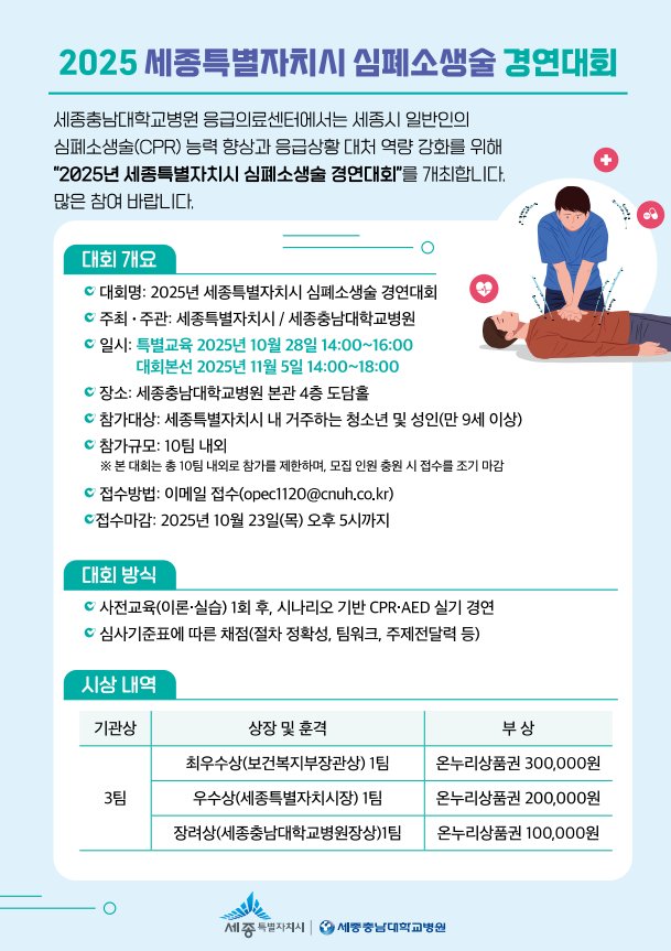 [충청중심뉴스] 세종시(시장 최민호)가 다음달 5일 세종충남대학교병원 도담홀에서 개최하는 2025년 세종시 심폐소생술(CPR) 경연대회 참가자를 모집한다.