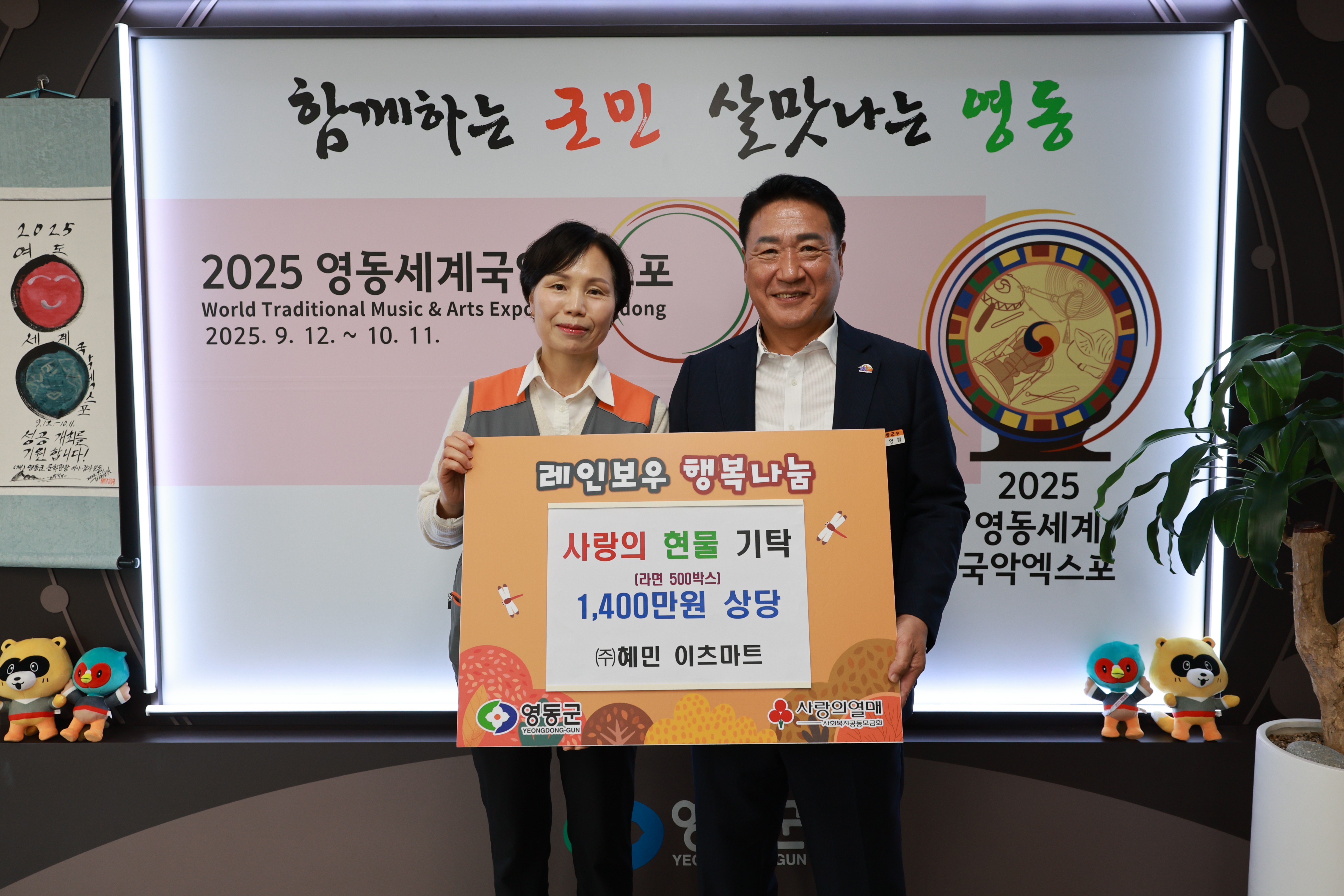 이츠마트는 14일 영동군에 1,400만원 상당의 라면 500박스를 기탁하며 어려운 이웃과 복지시설 등에 전달해 달라며 온정을 나눴다.