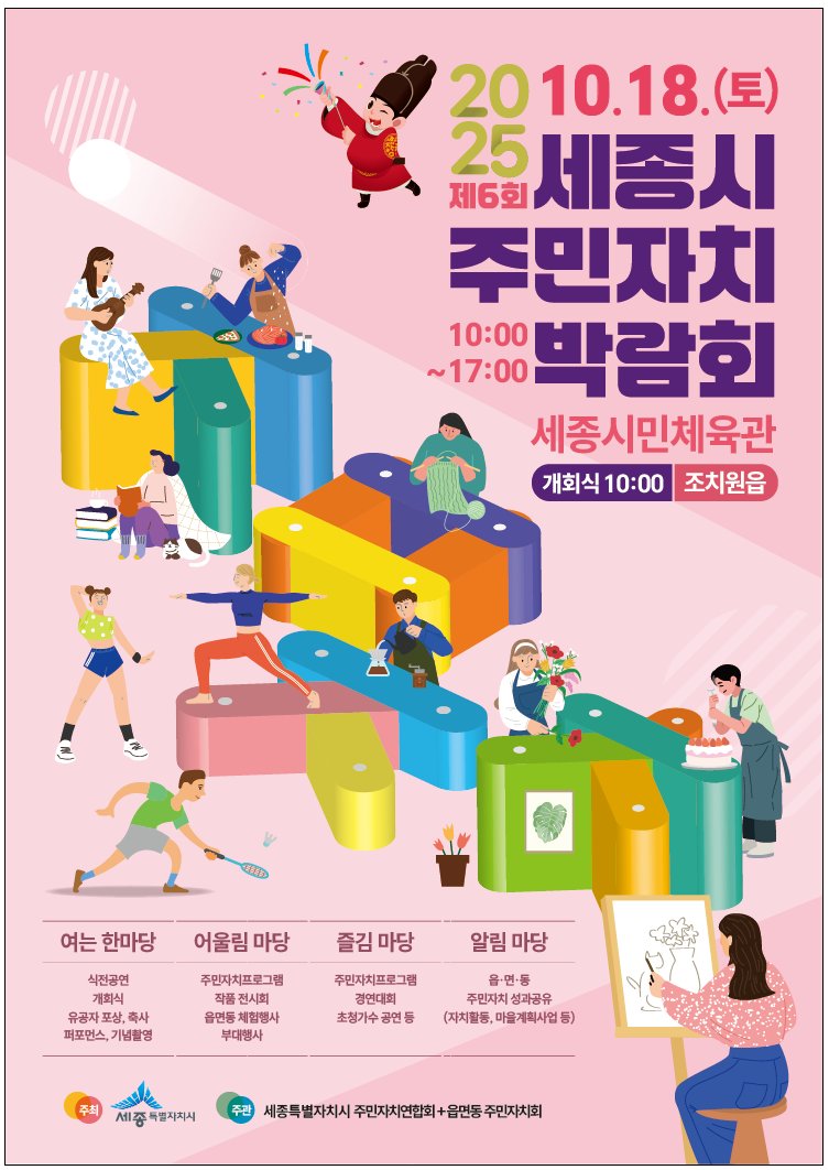 [충청중심뉴스] 세종시(시장 최민호)가 오는 18일 조치원읍 세종시민체육관에서 ‘주민의 손길로 가꾸어, 세종의 내일을 꽃피우다’를 주제로 제6회 세종시 주민자치박람회를 개최한다고 밝혔다.