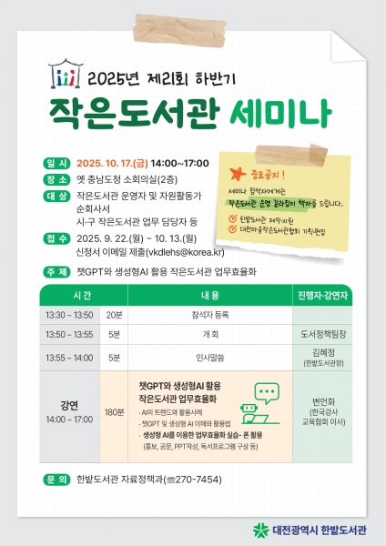 이번 세미나에는 변언화 한국강사교육협회 이사의 ‘챗GPT와 생성형AI 활용 작은도서관 업무효율화’에 대한 강연을 진행하며 △챗GPT 및 생성형 AI 이해와 활용법 △모바일 기반 업무효율화 실습으로 구성된다.