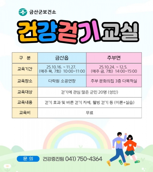 [충청중심뉴스] 금산군보건소는 군민의 건강증진과 생활 속 신체활동 실천을 위해 오는 12월까지 금산읍·추부면에서 건강 걷기 교실을 운영한다.