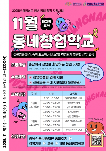이 교육은 충남신용보증재단 누리집 교육 게시판에서 신청할 수 있으며 자세한 사항은 해당 공고문 및 충남신용보증재단 창업성장지원부로 문의하면 된다.