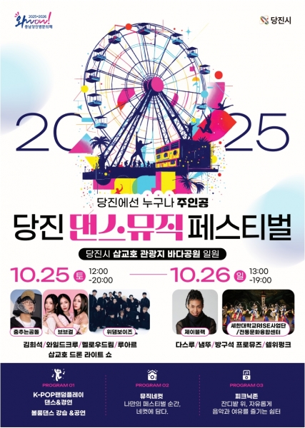 [충청중심뉴스] 당진시가 오는 25일과 26일 이틀간 삽교호 관광지 바다공원 일원에서 ‘2025년 당진 댄스&뮤직 페스티벌’을 개최하며 '춤과 음악으로 하나 되는 당진, 당진에선 누구나 주인공'이라는 주제로 화려한 가을 축제의 장을 펼친다.