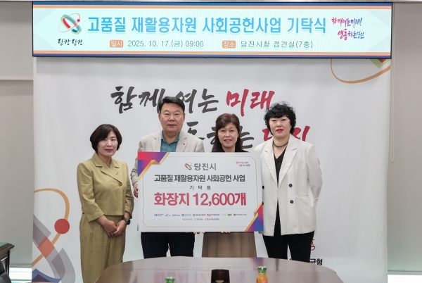 ‘고품질 재활용자원 사회공헌사업’은 사업장 및 청소년단체 등에서 배출되는 투명 페트병, 우유팩, 폐건전지 등 고품질 재활용 자원을 분리배출해 당진시에 인계하면, 시가 이를 재활용 화장지로 교환해 당진시복지재단을 통해 취약계층과 복지시설에 전달하는 사업이다.