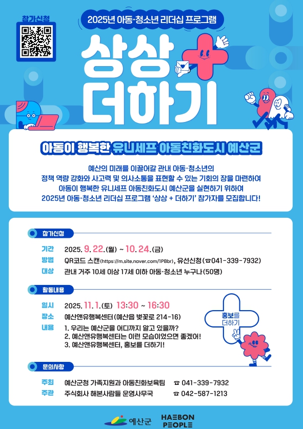 [충청중심뉴스] 예산군은 아동·청소년이 주체가 돼 아동친화도시 조성에 참여하는 ‘상상+더하기 아동·청소년 리더십 프로그램’의 참가자 모집기간을 기존 10월 17일에서 24일까지로 연장했다고 밝혔다.